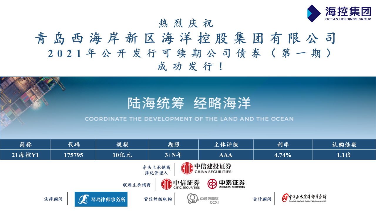 4月20日,海控集團成功發行新區首筆公募可續期公司債券“21海控Y1”發行規模為10億元,票面利率4.74%,期限為3+N年期。該筆可續期公司債券西海岸新區國有企業首筆公募可續期公司債券