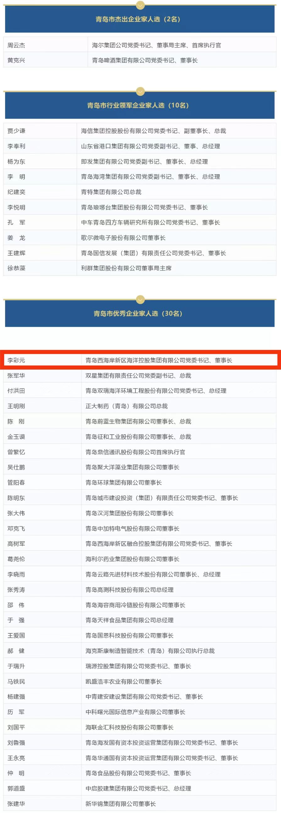 2022年度評選出的首批企業家中,“青島市杰出企業家”獲得者分別為海爾集團公司黨委書記、董事局主席、首席執行官周云杰,青島啤酒集團有限公司黨委書記、董事長黃克興。